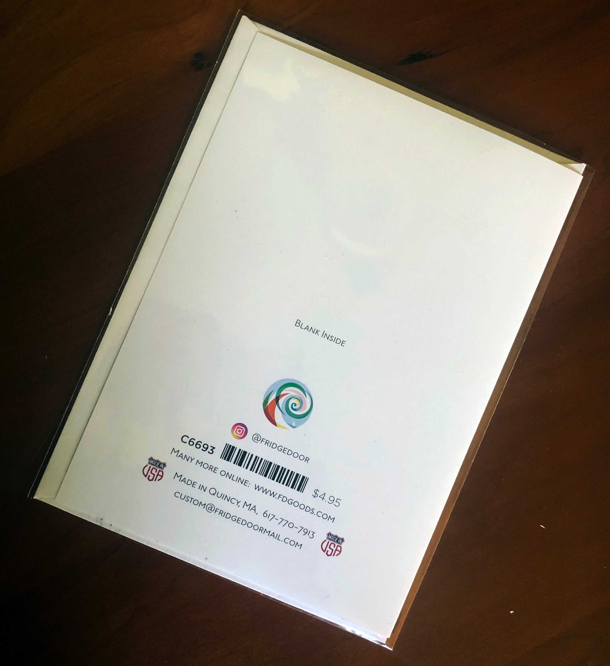 The greeting card measures 5 x 7 inches, is blank inside, and ships with an envelope.